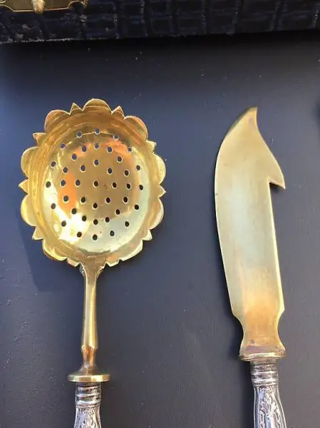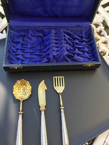 sehr hübsches Set zum schöpfen und ein Buttermesser, 800er Silber Vorderteil vergoldet, guter Zustand, Länge des Bestecks 14 cm,