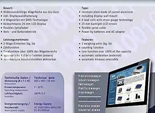 Funktionen: Zwei Einheiten (kg und lb), Zählfunktion, Tara (auf "0" setzen), externe Kalibrierfunktion, automatische Abschaltfunktion einstellbar (deaktiviert, 0,15,30,45 oder 60 Minuten)