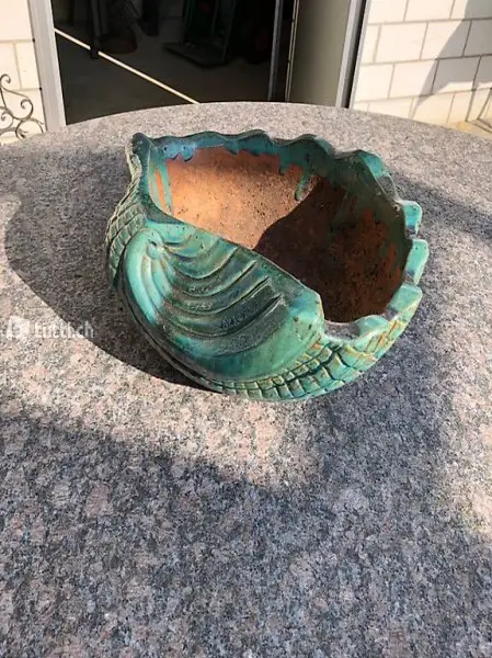 Blumenschnecke aus glasiertem Ton, grün. Mit Ablaufloch. Breite -.30cm.