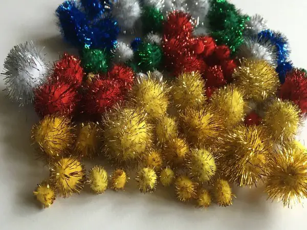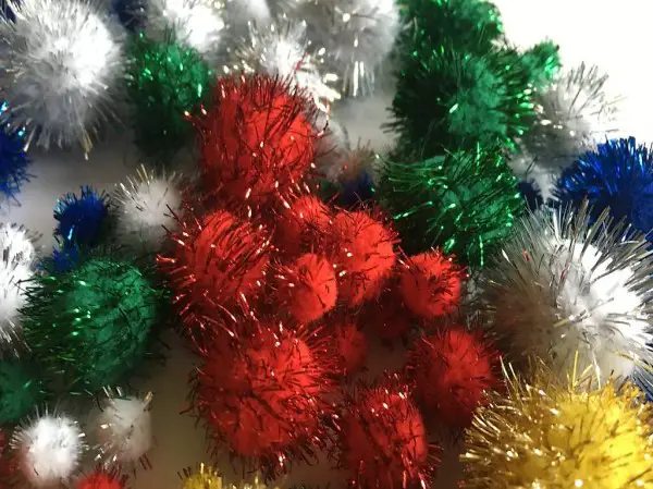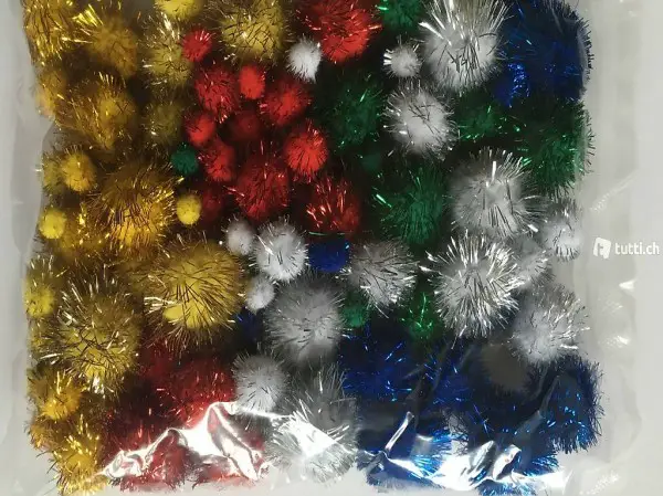 Pompon mit Lametta Fäden für Bastelideen aller Art, speziell für Weihnachten, Geburtstag, etc.