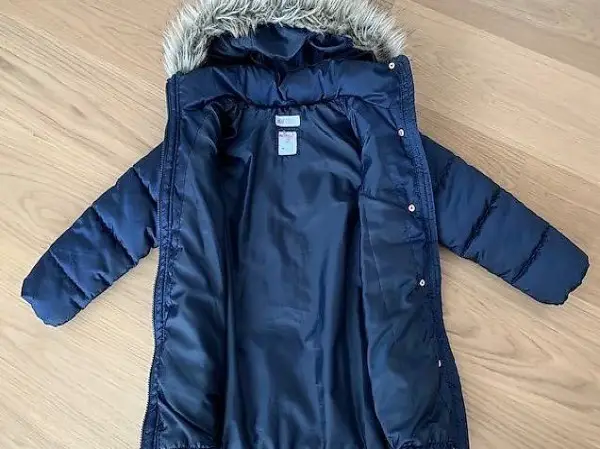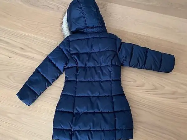Der Mantel hat eine abnehmbare, wattierte Kapuze mit Kunstfell und einen Frontreissverschluss mit Kinnschutz.