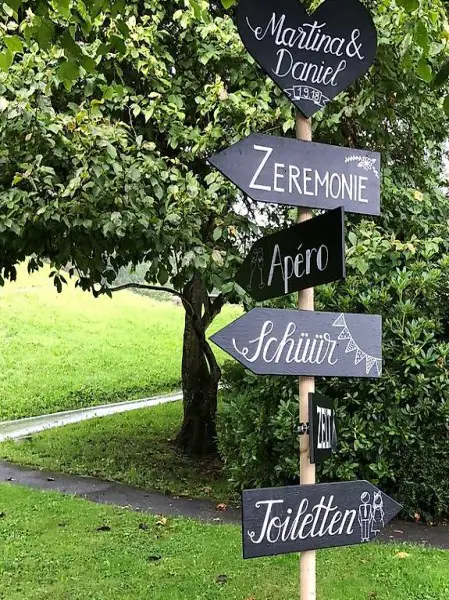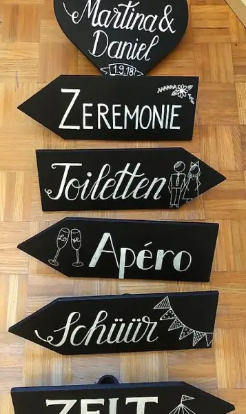 Die Pfeile sind mit Wandtafelfarbe bemalt und werden individuell von Hand beschriftet mit ihrem Wunschtext