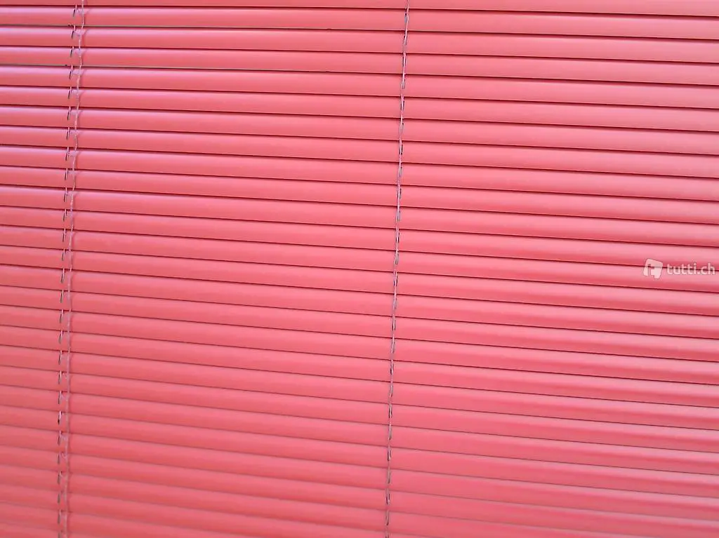 Roter "Lammellenvorhang" 140 cm breit, kann auf bis 162 cm stufenlos heruntergelassen werden. Lamellen können auch aufgeklappt werden