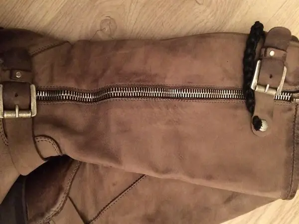 Reissverschluss und Zierverschluss oben (mit Druckknopf), Farbe Taupe, angeschrieben mit Gr. 35, entspricht jedoch mindestens 36.