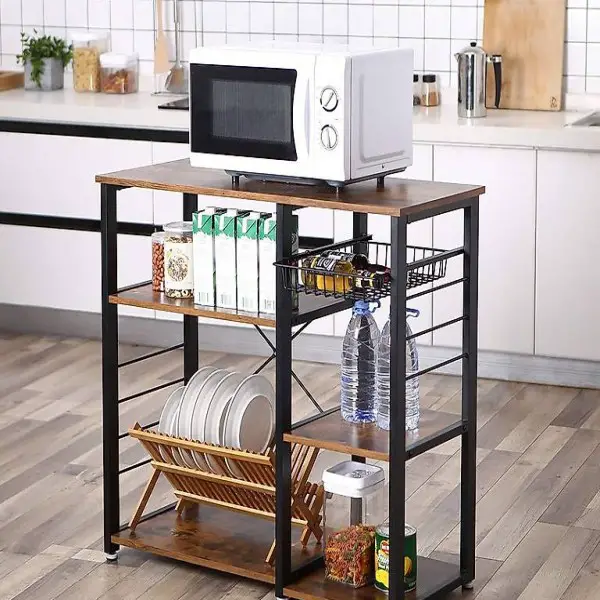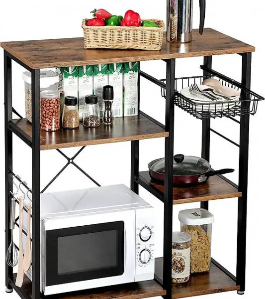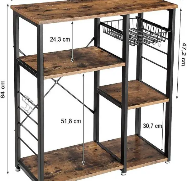 platzsparendes Mikrowellenregal mit Stahlgestell und Drahtkorb, mit 6 Haken, Industrie-Design, Holzoptik, vintagebraun-schwarz