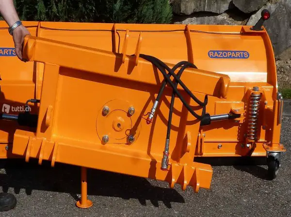 Leichter Schneepflug mit Kombi-Anbauträger für Traktor Kat. 1 + 2 und Frontlader Euro 8. Passend an grosse Vierradmäher oder Traktoren von 40 bis 100 PS. Zuverlässige Auffahrsicherung über Federpakete (links/rechts getrennt). Hydraulische Schwenkvorrichtung mit 2 robusten, doppelwirkenden Zylindern. Bedienung über 1 DW-Hydraulikventil. Automatischer Pendelrahmen +/- 8 Grad mit Federzentrierung. Arbeitsbreite Min./Max. ca. 2500/2900 mm, Pflughöhe 800 mm, Gewicht ca. 475 kg. Schneepflug komplett mit LED-Beleuchtung und Stützfuss für eine sichere Demontage.