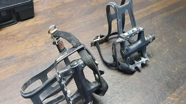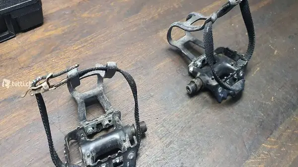 Funktionstüchtige Pedalen mit Laschen, um die Füsse beim Fahren zu befestigen.
