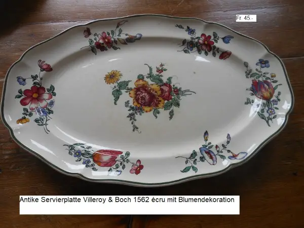 Blumenmuster Mettlach gestempelt 1562 / HO 27 / 12 écru, farbigem Blumenmuster, 39x26,5cm, guter Zustand Fr. 45.-