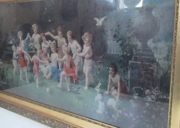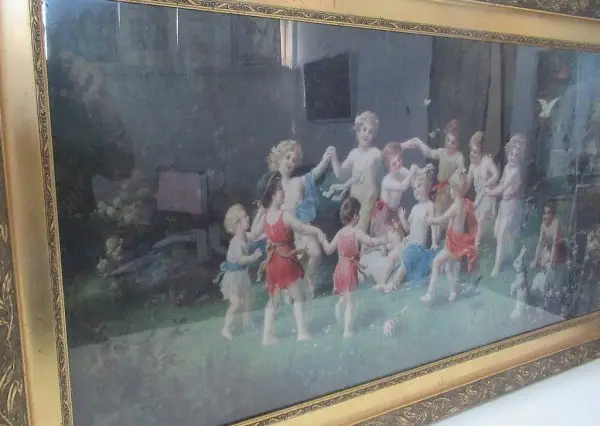 Jugendstil-Rahmen aus goldfarbenen Metall. Druck und Rahmen im guten altersbedingten Zustand. Masse 135x68 cm.