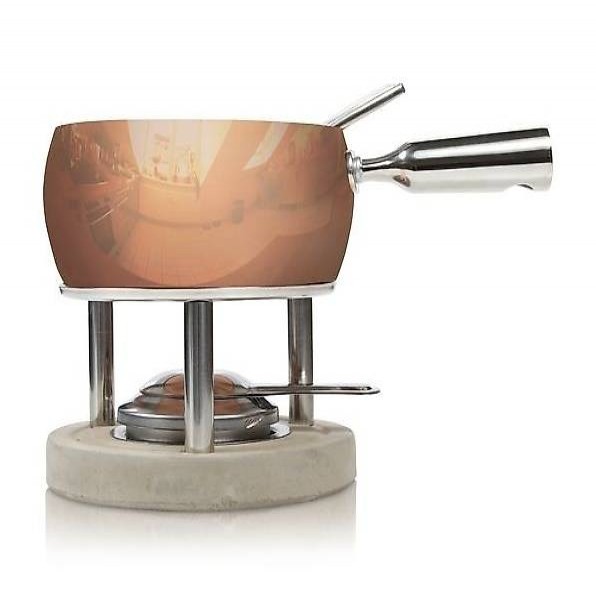 Material: Topf: Kupfer, Gestell: Steingut (Beton) und Metall, Fonduegabeln und Brenner: Edelstahl