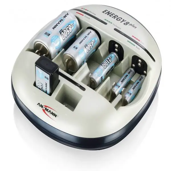 Das mikrocontrollerüberwachte Ladegerät Energy 16 plus hat Lademöglichkeit für 1-12 Micro AAA / Mignon AA, 1-6 Baby C / Mono D, 1-2 9V Block NiCd/NiMH-Akkus.