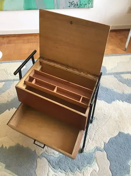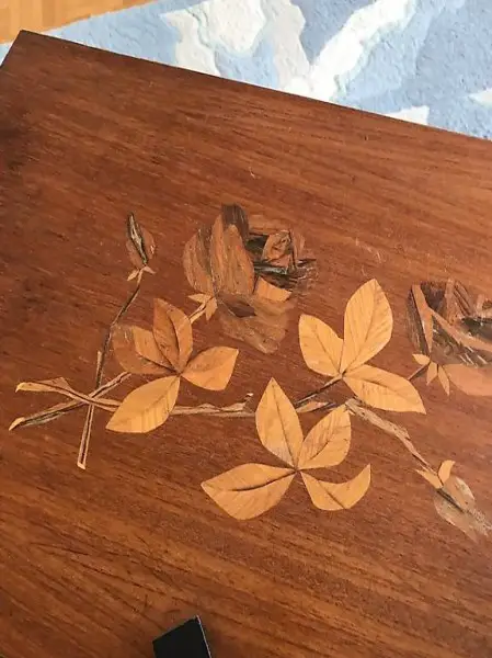 Sehr stabil und schwer. Mit Intarsien. CIrca 40 cm hoch, 40 cm breit und 30 cm tief.