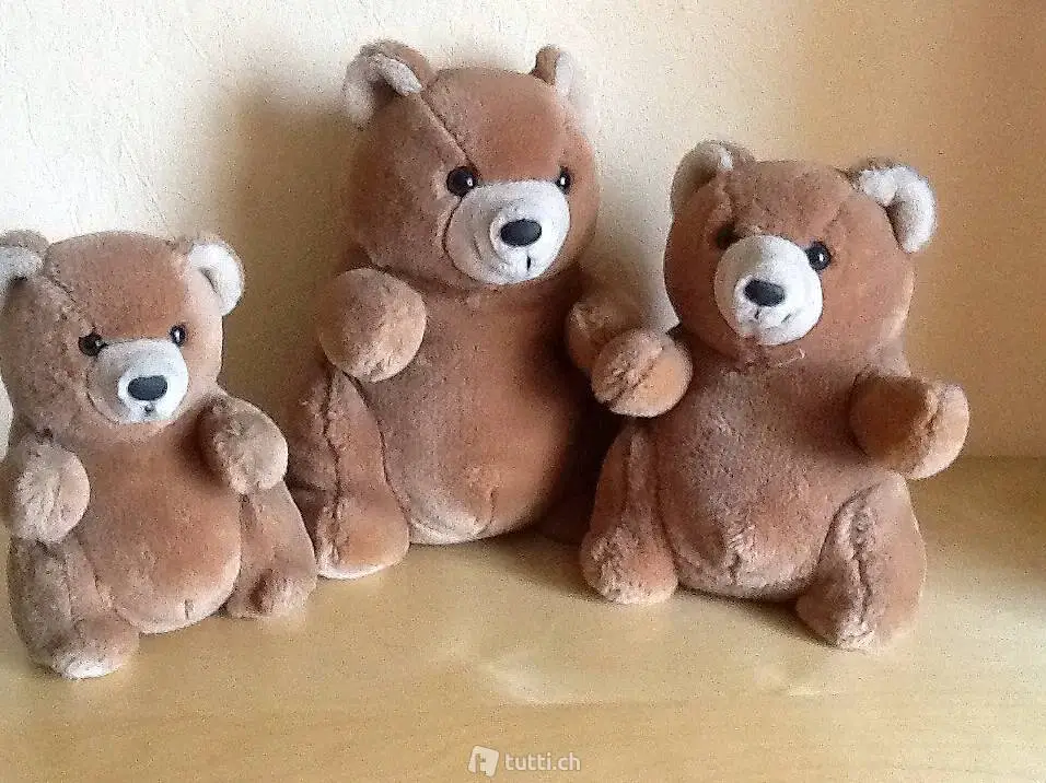3 braune Bären in unterschiedlichen Grössen. Die Bären sind ohne Drähte und sehr weich. Die Bären sind braun und haben Glasaugen.