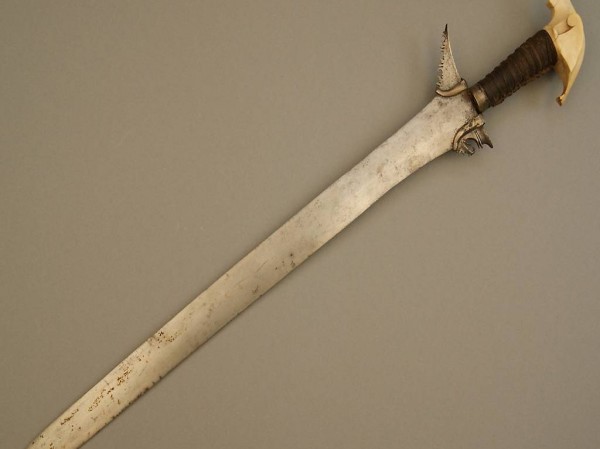 Griff mit Wicklung aus dunkler Schnur, klingenseitig Zwinge aus Silber mit feinen Rillen, Knauf aus Bein mit ausladenden Endungen