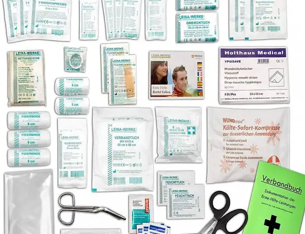 lange Mindesthaltbarkeit des sterilen Inhalts: ca. 5 Jahre Qualitäts-Verbandsmaterial aus laufender deutscher Produktion Für Baustellen bis 10 Personen Herstellungs- & Verarbeitungsbetriebe bis 20 Personen Verwaltungs- & Handelsbetriebe bis 50 Personen (lt. ArbStättV & Unfallverhütungsvorschrift)