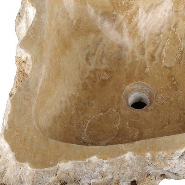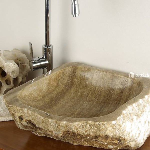 Sehr schönes, vollmassives Designwaschbecken, innen handpoliert, aussen naturbelassen aus gelblichem bis rötlichem Marmor. Mit diesem hochwertigen und toll verarbeiteten Steinwaschbecken setzen Sie in Bad und Gäste-WC bleibende Akzente.