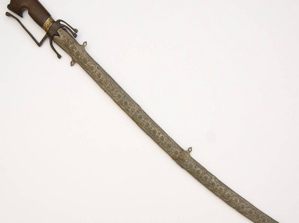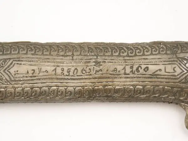 Scheide aus Zinn graviert, drei Trageösen, Vorderseite mit 32 Roseten verziert, Rückseite mit Rankenwerk und einer Inschriftenkartusche mit arabischer Schrift sowie zwei Jahreszahlen: 1260 und 1850
