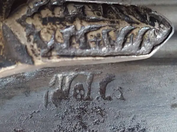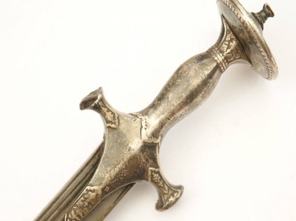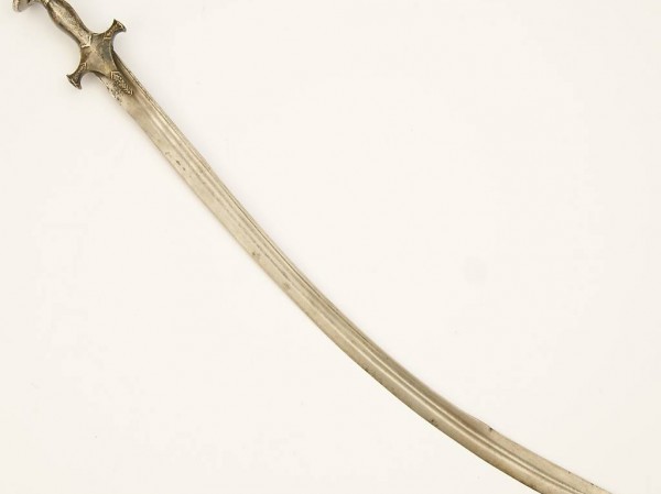 Klinge höchstwahrscheinlich aus Wootzstahl, am Ansatz terzseitig mit Marke, beiderseits mit zwei Hohlbahnen und zwei feinen Hohlkehlen, ca. 20cm langer Jelman