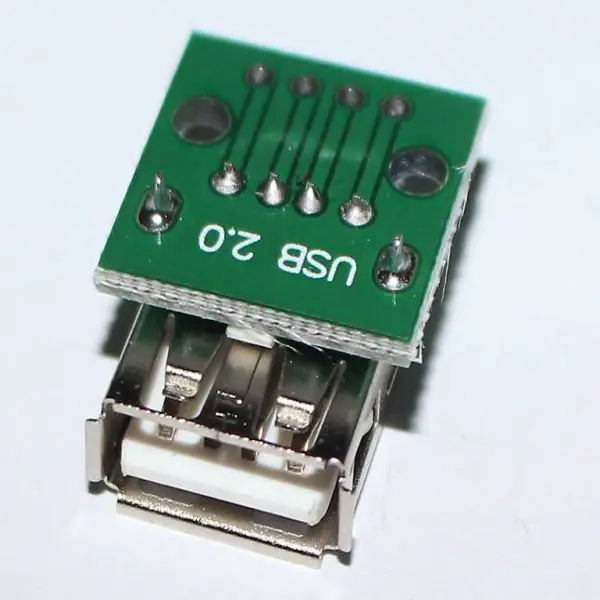 Einfache Möglichkeit um die Anschlüsse eines USB Steckers z.B. auf ein Breadboard zu bringen. Alle 4 Pins werden auf 2.54 mm Bohrungen herausgeführt.