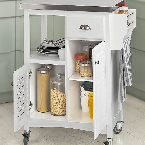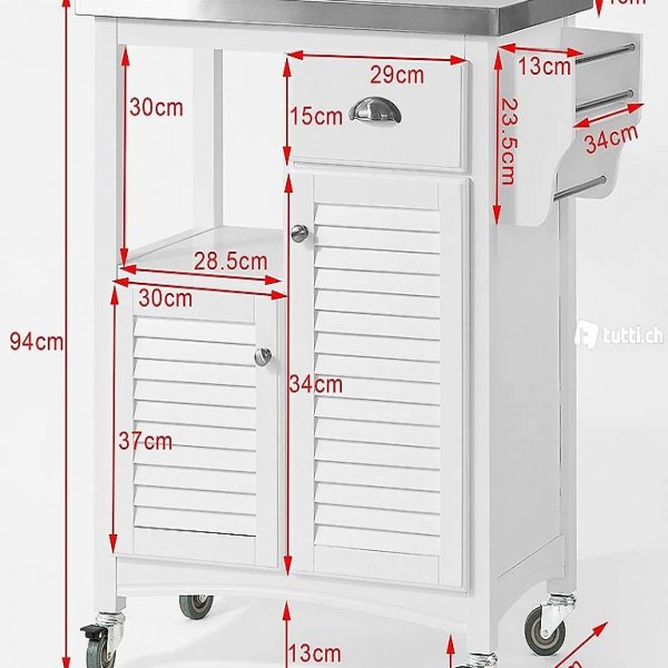 Material: Holz mit MDF, weiss lackiert. Edelstahlplatte; Gewicht: ca. 29 KG,Belastbarkeit: 60 KG; Masse: B71xT45xH94cm