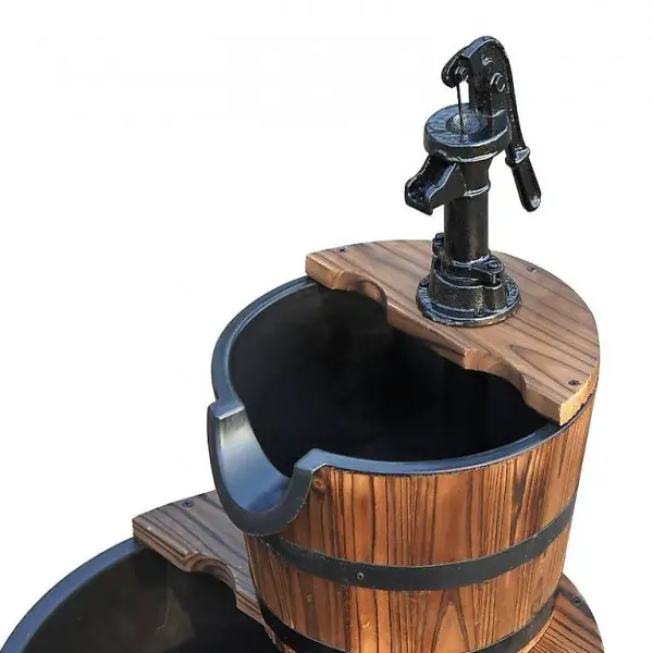 Brunnen mit Holzfässern und Hahn im Pumpen-Design