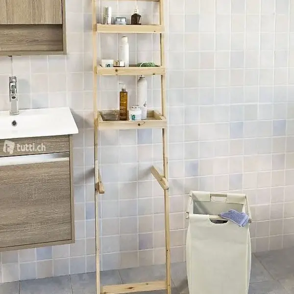 Regal bietet optimale Ablageflächen für Handtücher, Kosmetik und andere Kleinigkeiten.