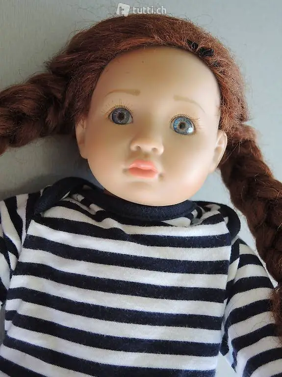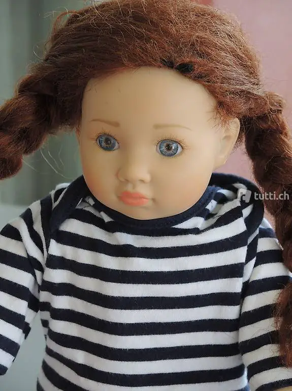 Kopf- und Gliedmassen aus hellem, matt-finish Vinyl gefertigt, bruchsicher, Augen und Wimpern fest eingesetzt, Arme und Beine vollbeweglich.