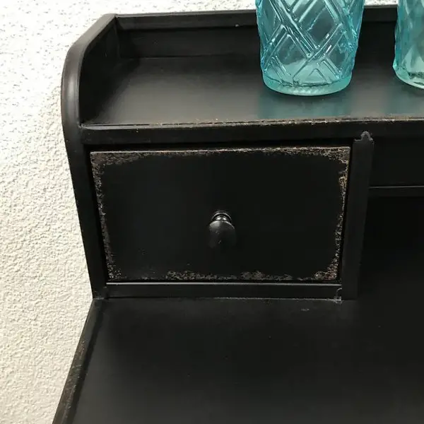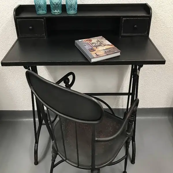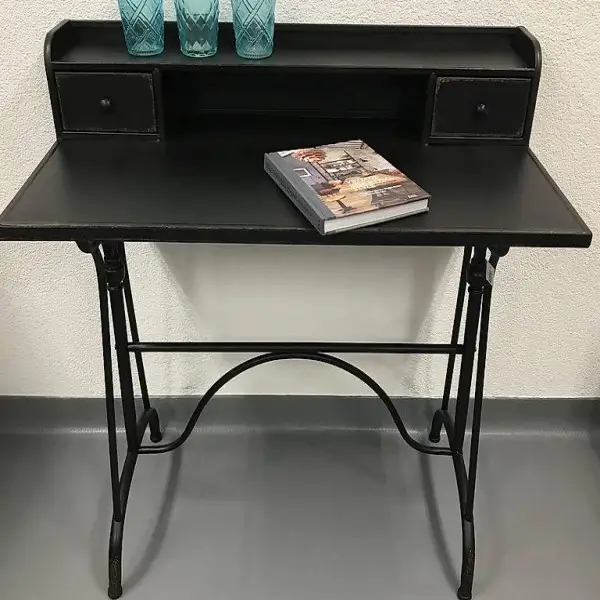 Klassischer Schreibtisch / Sekretär Oxford in schwarzem Metall mit zwei kleinen Schubladen. Das Möbelstück ist im Industrial-Stil mit Used-Optik und hat Unregelmässigkeiten in Farbe und Oberfläche.