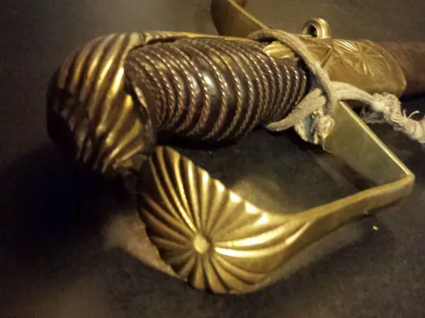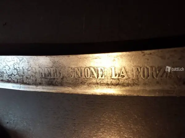 Klinge beiderseits mit je einer Hohlbahn und geätze Inschrift und Verzierungen