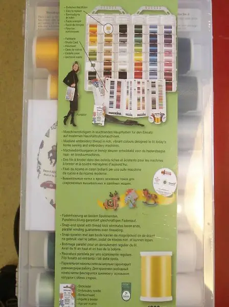 Stickfaden Box mit 40 Spulen Faden Rayon zu 1000m (1000m entspricht 200´000 Stichen), mit zwei Spulen Bobinfil zu 1500m, mit einer CD mit 42 Stickdesigns, mit einem Pack Sticknadeln.