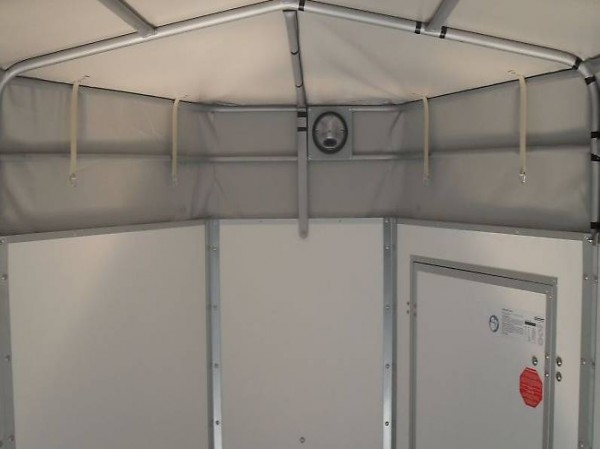 Gestell aus Rundrohre, Blache vorne in der Schräge aufrollbar. Seitenhöhe 190cm, Giebelhöhe 202cm.
