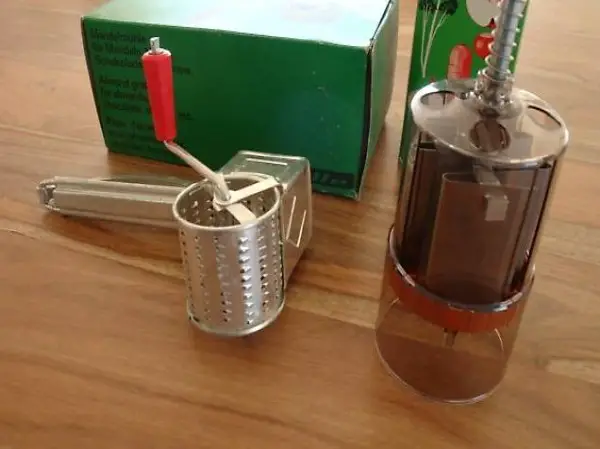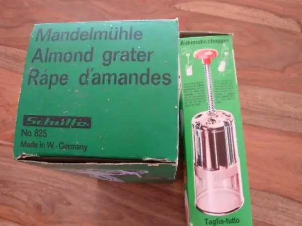 Nie benutzte Nussreibe und Zwiebelhacker in der Originalverpackung. Aus den ca. 1950er Jahren.
