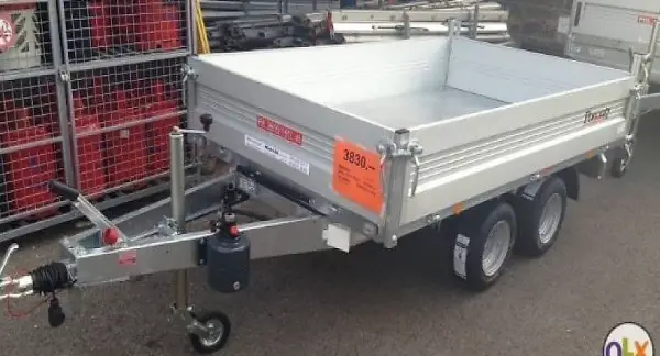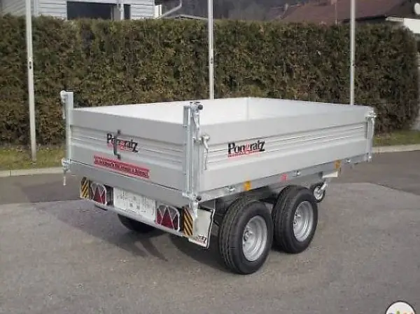 Rückwärtskipper Gesamtgewicht 2000kg, Nutzlast ca. 1450kg, Innenlänge 260cm, Innenbreite 151cm, Innenhöhe 36cm. Stahlboden feuerverzinkt, seitlich bis unter die Brücke umlaufend, Sicherungsstütze, Alu-Bordwände, alle vier Wände abklappbar, hinten auch pendelbar, alle 4 Eckpfosten abnehmbar. Stabiler verschweisster und feuerverzinkter Unterbau und Fahrgestell, Tandemachser mit Gummifederachsen, Rückfahrautomatik, Stützrad.