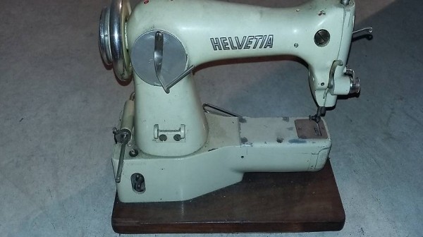 alte Nähmaschine Helvetia auf Holzbrett