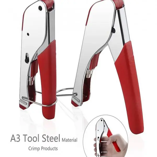 Wesentliches Hochleistungs-Crimpwerkzeug für die Montage von Schnappverschlüssen und F-Steckverbindern.