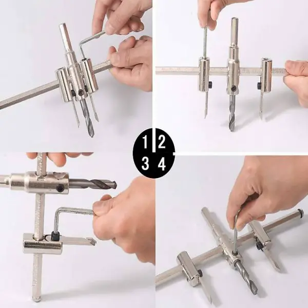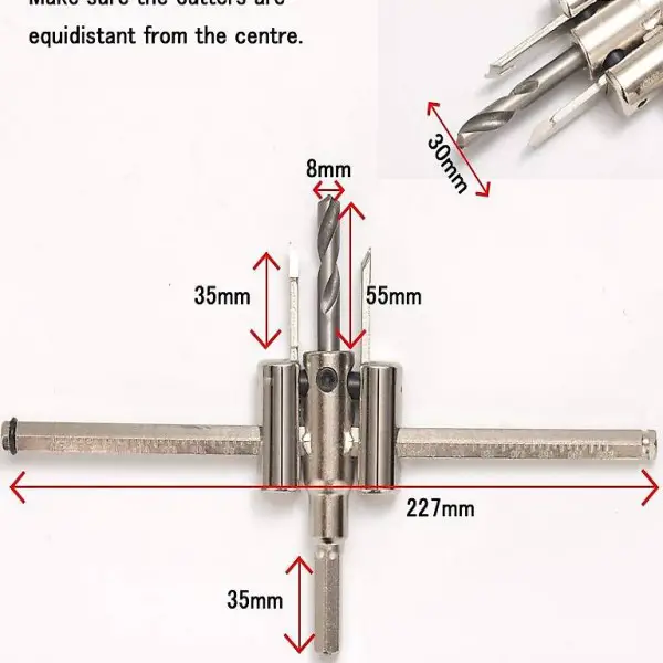 Holz Verstellbar Lochabstand: 30-200mm, damit Sie können den Lochabstand nach Ihrer Bedürfnisse einstellen und es kann saubere Schnitte bieten. Das Kreislochsäge Set wird mit Innensechskant-