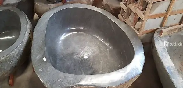 Die Wanne wird in Bali von Hand aus Stein gefertigt. Braune Stellen in der Farbe können entfernt werden.