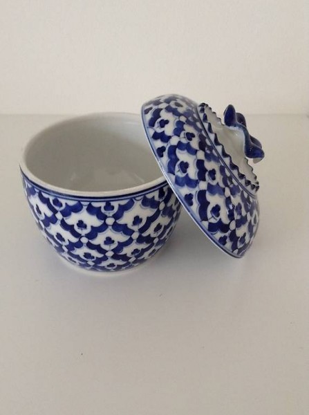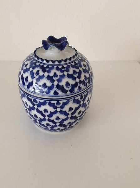 Die zwei Prozellandosen sind sehr ähnlich gemustert, blau/weiss, orientalische Art, und passen perfekt zusammen. Der verschnörkelte Griff des Deckels ist wie eine