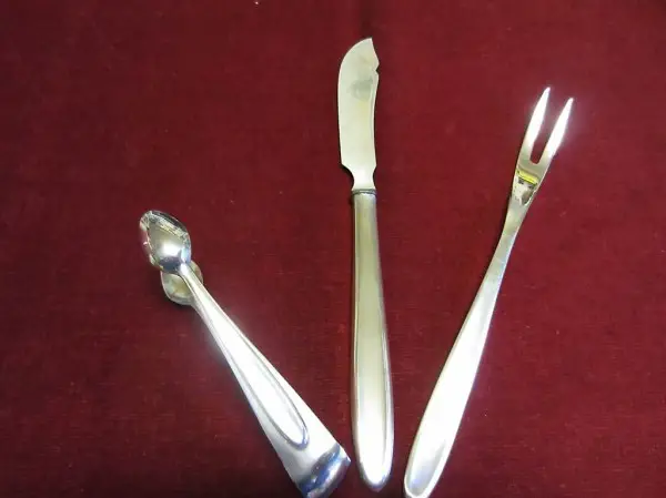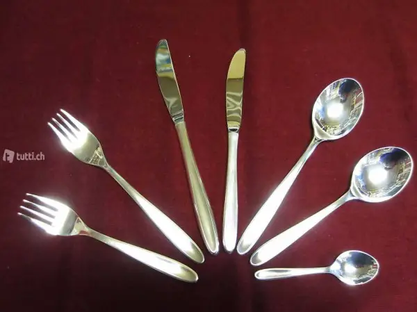 , 6 Essgabeln, 6 Tafelmesser, 6 Dessertlöffel, 6 Dessertgabeln, 6 Dessertmesser, 6 Moccalöffel, 1 Fleischgabel, 1
