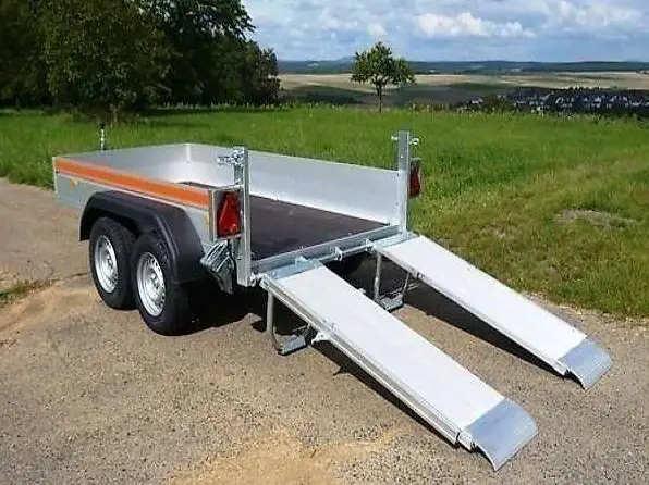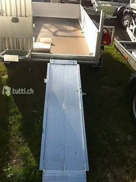 Tandemachser mit Auflaufbremsen und Rückfahrautomatik, Gummifederachsen, 50mm Kugelkupplung, verstärkter und verschweisster, feuerverzinkter Rahmen. Siebdruckboden, 4 Binderinge (es können mehrere nachgerüstet werden) , 2 Alu-Auffahrrampen mit integrierten Stützbügel seitlich verschiebbar, Alublech zwischen den Rampen. 12 Volt-