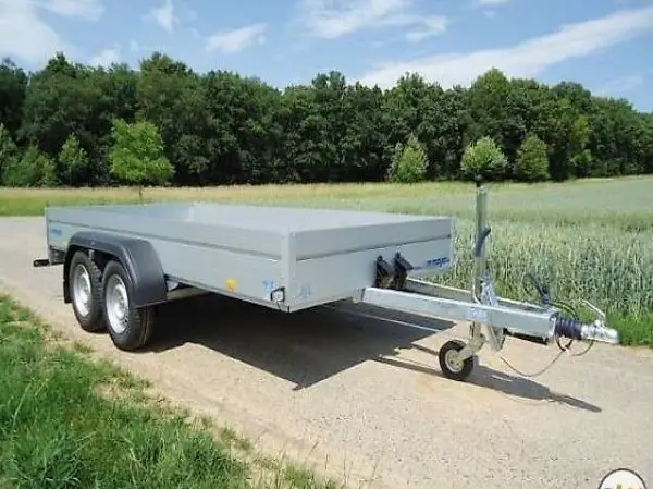 Tandemachser mit Auflaufbremsen und Rückfahrautomatik, wartungsfreie Gummifederachsen, V-Deichsel. Aluminiumwände, hintere abklappbar, Siebdruckholzboden. 12-Volt