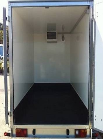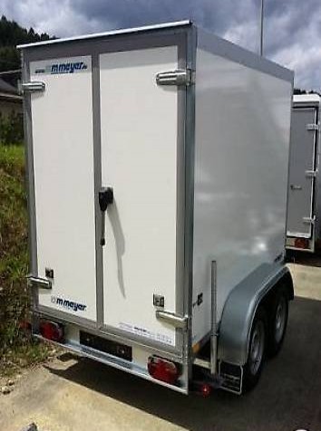 Kühlanhänger inkl. Kühlaggregat 230 Volt, WM Meyer Typ 2025/145 AZKF.Regelbereich +2° / +10°, Iso-Sandwichaufbau 60mm K-Wert 0,52, hinten 2 Flügeltüren mit Kühlzellenverschluss. Innen auf drei Seiten Rammschutz aus Siebdruckholz ca. 25cm hoch, Boden Siedbruck mit Iso,