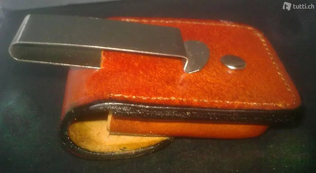 Leder mit clip auf der Rückseite, made in Japan, in zwei Farben verfügbar: schwarz und rotbraun. Das Etui wird in durchsichtiger