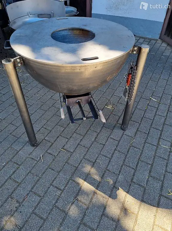 Grillplatte, Edelstahlrost d=30 cm, massiver Aschenschublade, Scheuerhaken, Aschenschieber, Alu-Deckel, Niveaulierfüsse.