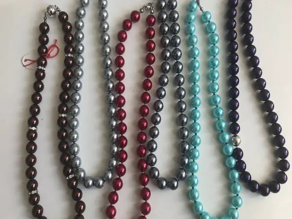Sechs Perlenketten in verschieden Farben und Kreationen, alle sind neu, Preise variieren siehe unten,