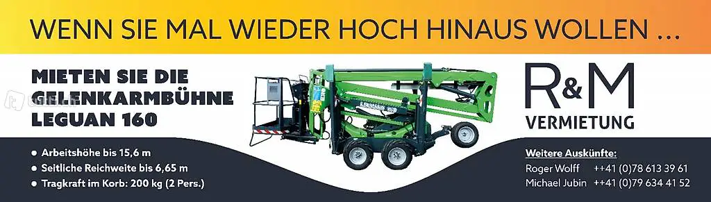 Tages, Wochen oder auch Monats Pauschalen sind möglich, aber auch unschlagbare Preise für kurz Einsätze sind möglich, sie können die Bühne selber bedienen oder wir stellen einen mann der die Bühne für sie bedient.