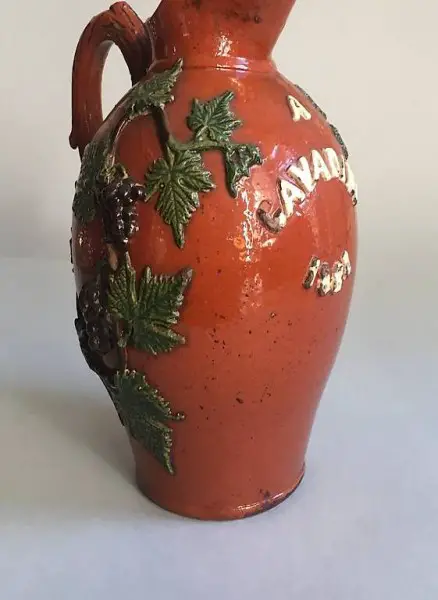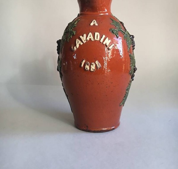 Brocca in terracotta del 1884, firmata A CAVADINI, con decori foglie e uva, misure 25x 20cm.