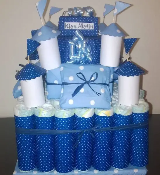 Torte Materialkosten (Rosa Torte: 1Sack Windeln, Feuchttücher, 2xCelebration, Mohrenköpfe, Plüschtier, über den Daumen 50.-) plus 40 für meine Arbeit.