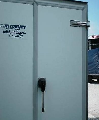 Kühlanhänger inkl. Kühlaggregat 230 Volt, WM Meyer Typ 3030/180 AZKF. Regelbereich +2° / +10°, Iso-Sandwichaufbau 60mm K-Wert 0,52, hinten 2 Flügeltüren mit Kühlzellenverschluss. Innen auf drei Seiten Rammschutz aus Siebdruckholz ca. 25cm hoch, Boden Siebdruck mit Iso,