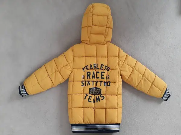Man kann die Jacke wenden. Die eine Seite ist gelb, die andere dunkelblau.
